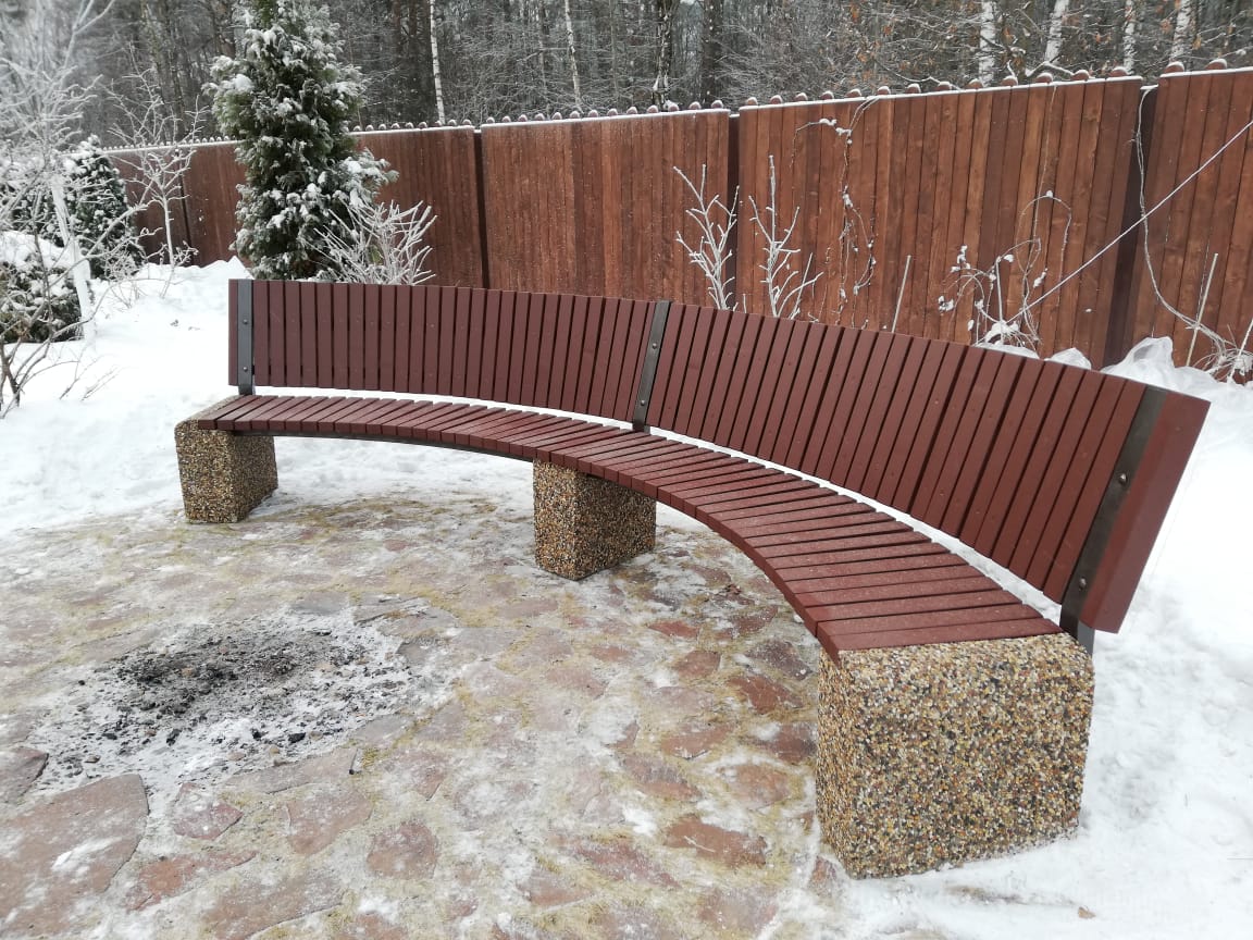 Технические характеристики: Размеры Скамейки "Евро 1 Арка 300 со спинкой": длина 320 см, ширина 46 см, высота 83 см. Вес: 325 кг. Скамейка "Евро 1 Арка 300 со спинкой"- качественная скамейка, вписывается в любой облик современного города. Скамейка предназначена для отдыха. Положение тела произвольное: сидя, лёжа или иное. Имеет полукруглую форму и наличие спинки. Основанием скамейки является два бетонно-монолитных с фактурой из натурального камня. Внешний фасад конструкции лавки имеет разные возможные фактуры: габбро-диабаз, красный гранит, московский гравий, мрамор "Шахматка", питерский гравий, серо-красный гранит, чистый бетон. Благодаря новым современным европейским технологиям в опорах отсутствует несущая металлическая конструкция, а значит опора не будет подвержена ржавчине. Сиденье скамейки состоит из деревянные рейки с сечением 40х80 мм, покрытых защитным составом с UF фильтром. Сиденье скамейки возможно как прямое так и изогнутое, относительно своей оси, деревянные рейки сиденья расположены перпендикулярно основанию скамейки. Возможные цвета сидения скамьи: орех, светлый дуб, палисандр, махагон, венге, серый жемчуг. Присутствует широкий выбор цветовой гаммы для идеального подбора цвета, подходящей для окружающей среды. Цвет может быть выбрать по индивидуальному желанию заказчика. Деревянный брус прочен и долговечен за счет антисептической обработки.
